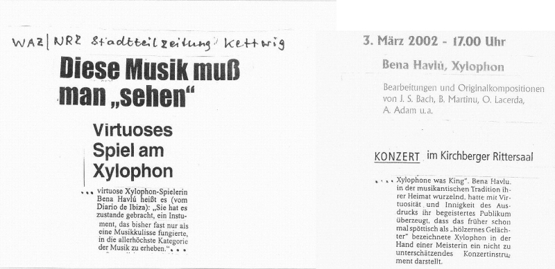 Die Solo-Konzerttätigkeit von Bena Havlů ist kein bloßes Experiment. Ihre Inspiration dafür war der Schöpfer des Xylophons Josef Michal Gusikov (1806 Shklov - 1837 Aachen), ein polnischer Virtuos des vierreihigen Konzert-Xylophons, eines Musikinstrumentes, das er für sich selbst schuf,auf das Konzertpodium einführte und damaliges Europa damit ganz blendete. Bena Havlů entschied sich, daß auch sie wird spielen das vierreihige Xylophon, welches sie später um die fünfte Reihe erweitert hat.